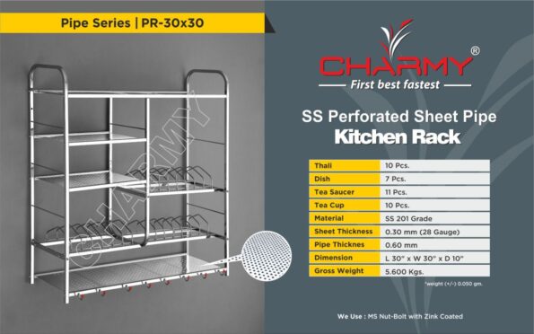 Enhance your kitchen organization with this durable stainless steel (S.S.) kitchen rack. Crafted with perforated sheet panels and sturdy piping, it offers excellent ventilation and strength. Measuring 30*30 cm and weighing 5.600 kg, this rack provides ample space for storing utensils, cookware, or other kitchen essentials. Its corrosion-resistant material ensures long-lasting performance, making it an ideal addition to any modern kitchen for efficient and tidy storage.